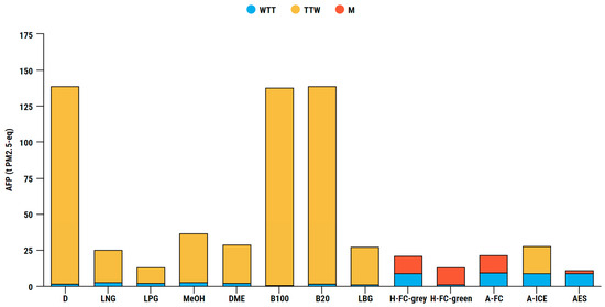 Aerosol Formation Potential, AFP (PM2.5-eq), was obtained by multiplying emission quantities by PM2.5 equivalence factors (PM10: 0.5; SOX: 0.54; NOX: 0.88) [86]: