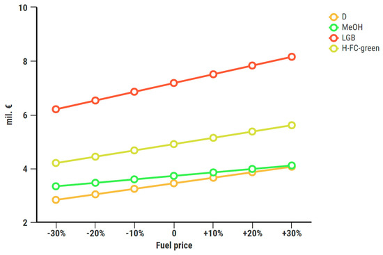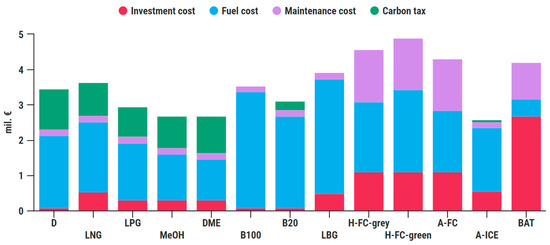 Besides the qualitative indicators shown in Table 1, environmental and economic analyses are crucial for the decision-making process, i.e., choosing the appropriate alternative fuel for a particular ship that operates in a specific area. Perčić et al. [62] performed a Life-Cycle Assessment (LCA) and Life-Cycle Cost Assessment (LCCA) of different marine fuels and indicated that among the considered alternatives, fully electrified ships are the most environmentally friendly and cost-efficient alternative to diesel power systems installed on ro-ro passenger ships.