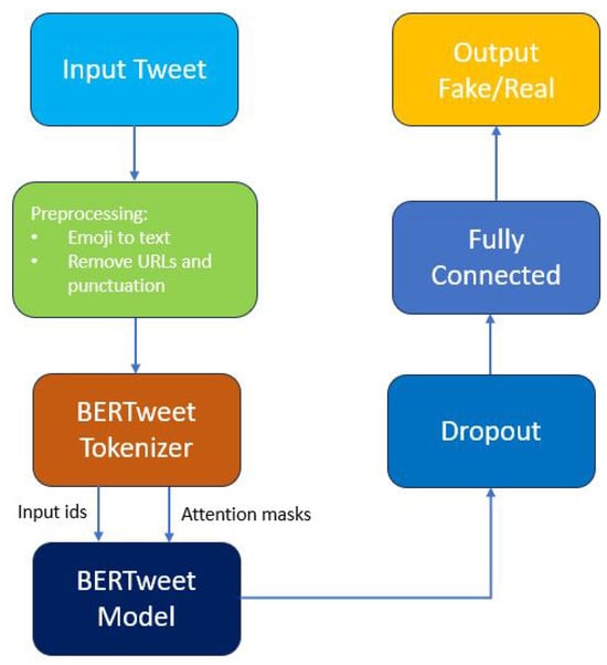 With respect to detecting from social media, BERT has been used along with its variations, like RoBERTa, in [,,,]. BERTweet is a fine-tuned BERT-based model trained on English tweets. It showed enhancement in tweet classification tasks compared to other BERT models. It was used recently to detect fake news from Twitter, as shown in [] and in an ensemble model in [].