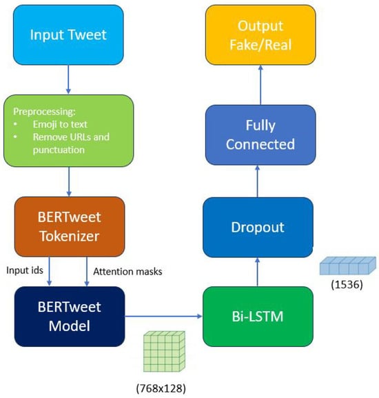 Rai et al. [] recently showed that feeding the BERT embeddings to a deep neural network model composed of an LSTM and a number of fully connected layers showed better results than using BERT only on FakeNewsNet news titles. Following that approach, we added a BiLSTM layer after the BERTweet layer for better extraction of the features from the BERTweet embedded vectors. The architecture of the model is shown in Figure 2.