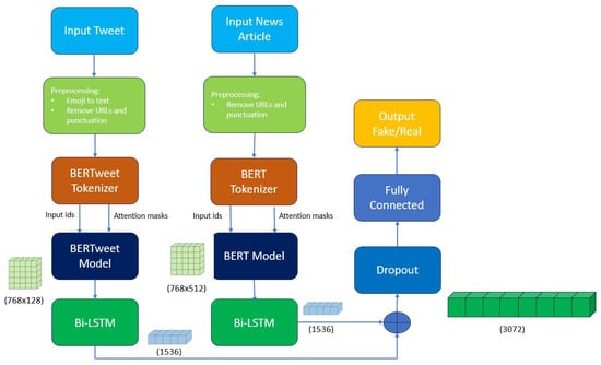 The model aims to capture the inherent differences in language, vocabulary, writing style, and limitations between news articles and users’ tweets. Therefore, it generates separate feature embeddings for news articles and tweets through passing each input to a separate BERT/BERTweet model followed by a BiLSTM layer, then concatenating the two feature vectors and passing the concatenated vector to the fully connected layer. Separating the embeddings of the tweets from the actual news article helps preserve the unique characteristics of each, and concatenating both vectors as inputs to the neural network helps balance the importance of each source, without having intrinsic weighting based on the volume of the articles/tweets. The proposed model architecture is shown in Figure 3.