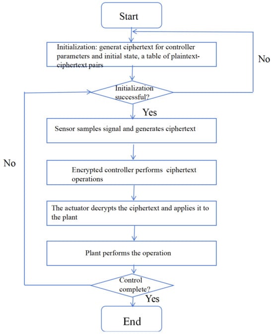 First, we encrypt the controller using the BFV encryption method and follow the method in the literature [16] to adopt precomputation to save the time of encryption. We describe the process for this scheme based on Figure 4 in the following. We have drawn the flowchart as Figure 5 to help understand.