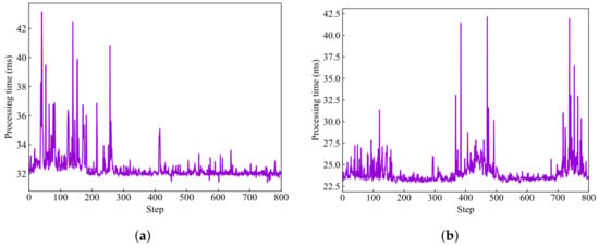 Figure 7 depicts the time change for computing the iterations of the controlled system following the BFV encryption of the controller. Figure 7a represents the calculation time of each iteration of the control system without BFV encryption using precomputation, with an average time of ms; Figure 7b represents the time after precomputation, with an average time of ms. As can be seen from the comparison of the two pictures, it is estimated that about of the time will be saved, which is still considerable.