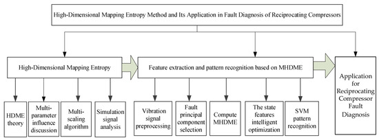 The main focuses of this paper include the discussion of high-dimensional mapping entropy, the construction of feature extraction methods and strategies, and the application of reciprocating compressor-bearing fault diagnosis. The specific research route is shown in Figure 1.
