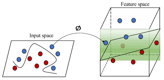 The essence of high-dimensional mapping entropy theory can be attributed to the principle of high-dimensional space mapping and the idea of kernel function classification. The literature [11] proposes a Gaussian kernel-based clustering method, which adopts the Mercer kernel mapping idea to map samples to Hilbert space on the basis of retaining essential features and achieves kernel space sample separability by enhancing the variability of data features in the high-dimensional space. Moreover, the kernel function high-dimensional space mapping theory is also widely used in the field of support vector machine (SVM) pattern recognition. The mapping theory process is detailed in Figure 2.