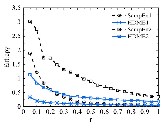 where , is the random signal , N the length of the signal, and the ratio p . The sample entropy and high-dimensional mapping entropy of the signals and are denoted as SampEn1, SampEn2, HDME1, and HDME2, respectively, and the entropy of the mixed signals with different similarity tolerances r are shown in Figure 4.
