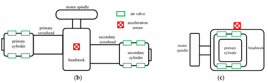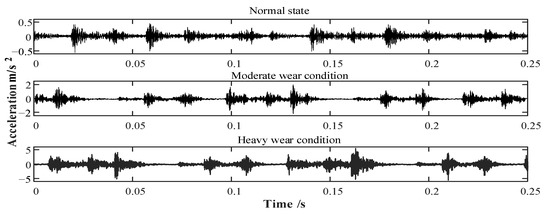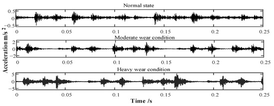 In the experiment, experimental data for different bushing wears of reciprocating compressors were collected, including normal state signal, moderate wear state, and heavy wear state. The spatial location of sensor measurement point A is visually depicted in Figure 10. According to the speed and sampling frequency of the reciprocating compressor, one working cycle is 0.12 s, and the data of two cycles are taken in each operating state for analysis. The vibration signals of the compressor bearings under normal and fault conditions are shown in Figure 12.
