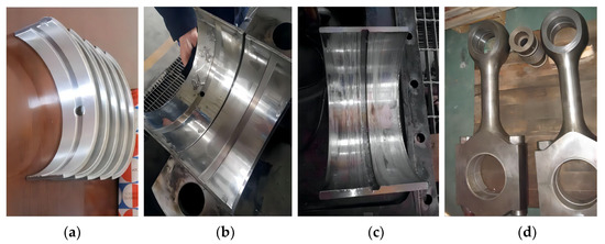 Connecting rod and different bearing bushing clearance failure test. (a) Normal clearance bushing. (b) Moderately worn bushing. (c) Heavily worn bushing. (d) Connecting rod.