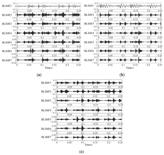 Several modal components are obtained in each state using the VMD method. The decomposition scale of the original sampled signal is preset to be and the bandwidth parameter . The BLIMF1-BLIMF7 components obtained from the decomposition of the different states are shown in Figure 13. The amount of VMD decomposition is humanly determined. If K is too small, incomplete decomposition and modal aliasing may occur. Whereas, if K is too large, over-decomposition may occur, resulting in loss of modal information. To address this problem, in this paper we screen the valid modal components of the original signal information by the correlation degree between the BLIMF components.