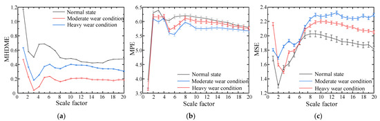 The signal samples of different states are preprocessed using the VMD method, and the components containing the main feature information are preferred for signal reconstruction. The MHDME algorithm was used to analyse and process each group of reconstructed signals, and the entropy under 20 scales for each state was calculated as state features. At the same time, the same process was used to calculate the MSE and MPE of the pre-processed signals by VMD, and the pre-selected scales were set at in VMD. To assess the stability of various algorithms, the values were calculated for three distinct working conditions. Parameter selection for entropy calculation was as follows: , , (SD is the standard deviation), time delay t in MHDME, , , in MPE, , , , t in MSE. The alterations in entropy for distinct bearing conditions are depicted in Figure 15a–c.