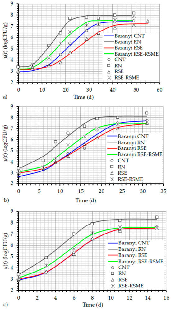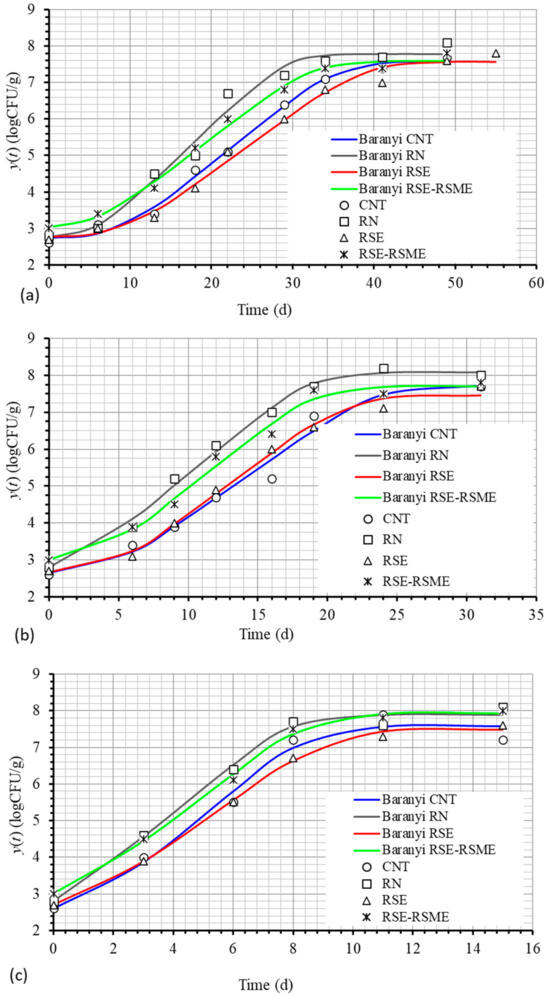 Figure 1. Isothermal growth data and fitted Baranyi and Roberts (1994) [31] model curves for APC in the four different categories of bacon samples, under different temperature storage conditions: (a) at 5 °C, (b) at 10 °C, and (c) at 15 °C. CNT represents the control case, RN corresponds to the bacon case with a 50% reduction in nitrites, RSE corresponds to the bacon case with a 50% reduction in nitrites and incorporation of the rose extract, and RSE–RSME indicates the bacon case with a 50% reduction in nitrites and incorporation of the rose–rosemary extract.