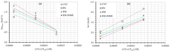 Figure 2. Arrhenius plots showing APC growth for the four different categories of bacon samples: (a) for the μmax and (b) for the lag phase (λ). The dotted lines represent the linear regression of the Arrhenius equations of the samples (blue: CNT samples; grey: RN samples; red: RSE samples; green: RSE–RSME samples).