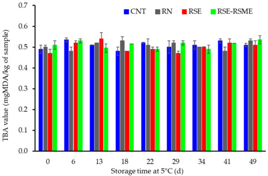 Figure 4. Average thiobarbituric acid reactive substance (TBAR) values for anaerobically packaged bacon slices during 49 days of storage at 5 °C (CNT: control samples, RN: reduced-nitrite samples, RSE: reduced-nitrite samples enriched with rose extract, RSE–RSME: reduced-nitrite samples enriched with rose and rosemary extract). Error bars represent the ± standard deviation of measurements.