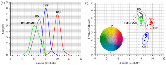 Figure 5. Color changes expressed with (a) a values (CIELab) and (b) combined a and b values of bacon samples (CNT: control samples, RN: reduced-nitrite samples, RSE: reduced-nitrite samples enriched with rose extract, RSE–RSME: reduced-nitrite samples enriched with rose and rosemary extract). Error bars represent the ± standard deviation of measurements.