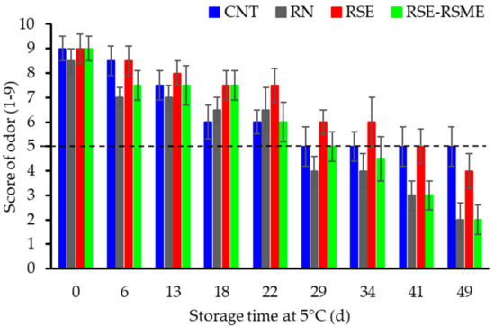 Figure 6. Sensory score for odor of bacon samples (CNT: control samples, RN: reduced-nitrite samples, RSE: reduced-nitrite samples enriched with rose extract, RSE–RSME: reduced-nitrite samples enriched with rose and rosemary extract) during storage under vacuum conditions at 5 °C for 49 days. Error bars represent the ± standard deviation of measurements. Black dashed line represents the acceptability limit.