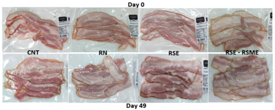 Figure 7. Bacon samples at day 0 (above) and at 49 days of storage (below) at 5 °C (CNT: control samples, RN: reduced-nitrite samples, RSE: reduced-nitrite samples enriched with rose extract, RSE–RSME: reduced-nitrite samples enriched with rose and rosemary extract).