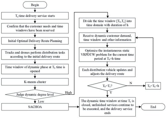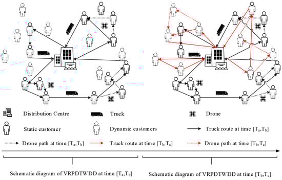 With the rapid development of drone technology, logistics companies have become increasingly interested in the field of drone delivery [1]. Drones have numerous advantages, such as not being restricted by ground obstacles, fast delivery, low cost, etc., ensuring that they can avoid traffic congestion and deliver goods to their destinations more quickly. However, the drone’s load capacity is small and the battery technology cannot support extended deliveries. These limitations render it impossible for the drone to complete the delivery service independently. Therefore, most logistics and delivery companies are more inclined to adopt a collaborative delivery model of trucks and drones [2]. Under this cooperative model, trucks are not only used for large-scale delivery tasks but also serve as a “mobile platform” for drones, which undertake small-scale delivery tasks. This model can fully exploit the advantages of trucks and drones, effectively avoiding traffic congestion and road restrictions, significantly reducing labor and time costs, and comprehensively improving service efficiency. Different from traditional truck delivery, in this model, trucks and drones are synchronously combined for delivery. Trucks and drones travel at different speeds, hence impacting the delivery time window. Additionally, in the actual delivery process, the distribution center continues to receive new demands after the truck leaves, resulting in constant changes in the status of the delivery system, which requires readjustment of the existing delivery route. If the delivery route cannot be planned and adjusted reasonably and quickly, it will not only greatly increase the operating costs of the enterprise, but also lower the customer service level. In summary, it is of great practical significance to study the vehicle routing problem with dynamic demand and time window under a collaborative delivery model of trucks and drones.