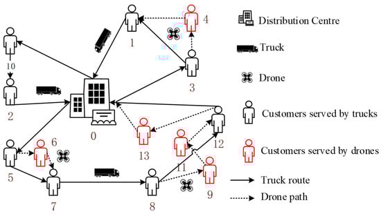 Murray and Chu [18] were the first scholars to propose the Flying Sidekick Traveling Salesman Problem (FSTSP) and establish a Mixed Integer Linear Programming (MILP) model, which laid the foundation for the drone–vehicle routing problem that has garnered considerable attention from both academia and industry. In this problem, a truck carries a drone to serve various customers. Each drone flight can only serve one customer. Ha et al. [19] solved the FSTSP problem by modifying the objective function from minimizing delivery time to minimizing delivery costs. They proposed two heuristic methods—TSP-Local Search (TSP-LS) and Greedy Rand Adaptive Search Procedure (GRASP)—to address this issue. Agatz et al. [20] presented the traveling salesman problem with drone (TSPD) that confined the drone retrieval node to the same location as the drone launch node. They designed a hybrid algorithm combining local search and dynamic programming to solve the problem. Meanwhile, Marinelli et al. [21] considered conducting along-route operations in TSPD, implying that the implementation of launch and retrieve can be performed along the route segment to enable the drone to serve a wider area. Chang and Lee [22] focused on discovering a better route based on TSPD to achieve a broader drone delivery area. They developed a nonlinear programming model and demonstrated its effectiveness. Yurek and Ozmutlu [23] devised a decomposition-based iterative algorithm for moderately scaled TSPD problems. Kim and Moon [24] added drone stations to TSPD and proposed the traveling salesman problem with drone stations. Wang et al. [25] investigated the bi-objective TSPD problem and proposed an improved non-dominated sorting genetic algorithm to tackle this problem. Additionally, certain studies focused on exploring exact methods [26,27] and heuristic algorithms [28,29] for FSTSP/TSPD.