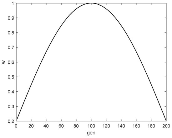 In traditional CHOA, the position of the attacker is very critical to finding the optimal solution. Other chimpanzees in the population change based on the location of the attackers. When the attackers fall into the local optimum, the population will also fall into the local optimum. In this study, the sine–cosine operator is added to the attacker’s position change, and a nonlinear learning factor (see Figure 5 for the value of 200 iterations) is introduced. The formula for the nonlinear learning factor and the sine–cosine operator is as follows: