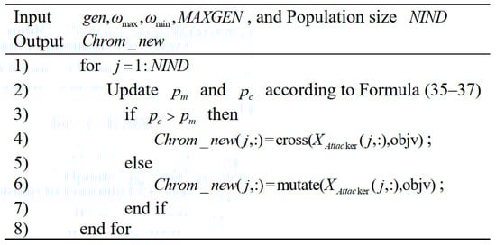 The pseudocode of the attacker’s position update is shown in Figure 6. First, the crossover probability and mutation probability are obtained according to Formulas (35)–(37). If , then use the OX operation to update the attacker’s position. Otherwise, use the mutation operation to update the attacker’s location.