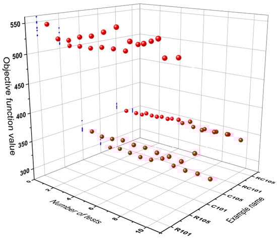 Figure 9 shows that during the 10 tests, the maximum value of the objective function of R101 is 558.2347, the minimum value is 527.6039, the average value is 541.8093, and the average error rate relative to the minimum value is 2.69%. The maximum value of the objective function of R105 is 535.0197, the minimum value is 507.3721, the average value is 516.1252, and the average error rate relative to the minimum value is 1.73%. The maximum value of C101 is 343.7847, the minimum value is 337.7465, the average value is 342.3882, and the average error rate relative to the minimum value is 1.37%. The maximum value of C105 is 301.5938, the minimum value is 297.6879, the average value is 300.4842, and the average error rate relative to the minimum value is 0.94%. The maximum value of RC101 is 370.7237, the minimum value is 349.6057, the average value is 363.3692, and the average error rate relative to the minimum value is 3.94%. The maximum value of RC105 is 348.8725, the minimum value is 341.6005, the average value is 344.94, and the average error rate relative to the minimum value is 0.98%. Of the six tests, R101 had the highest average error rate while C105 had the smallest. Overall, due to the limitations of the heuristic algorithm, the results of each solution fluctuate to a certain extent and the relative average error rate of the 10 tests is controlled within an acceptable range of 5%, indicating the stability of the designed algorithm and showing that it can be used to solve VRPDTW problems.