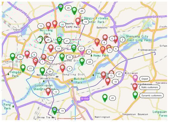 This study takes the customers of a self-operated store of a certain brand in Shenyang from 8:00 a.m. to 11:00 a.m. as the data for verifying the feasibility of the proposed method. During this period, the company provided services to 30 customers in total. The spatial distribution of customers is shown in Figure 10 and detailed information for the customers is listed in Table 5. The identifiers in the “Customer Type” column are explained as follows: a for canceled customers and b for newly added customers. The maximum loading capacity of the truck is 100 kg, the average speed is 30 km/h, and the unit delivery cost is about $0.78/km [52]; the maximum loading capacity of the drone is 12 kg, the maximum flight distance is 20 km, the average speed is 45 km/h, and the unit delivery cost is about $0.078/km [52].