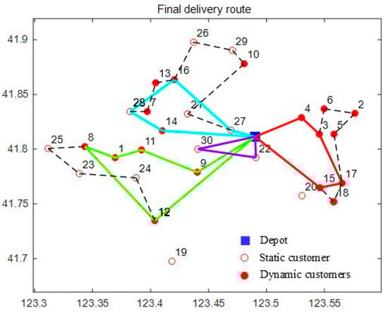 First, when entering the initial planning stage, we use the SACHOA algorithm to plan the delivery route for the initial static customers; the results are shown in Table 6.