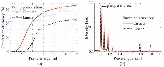 At the beginning of the studies, the WLC seed was not used for SRS generation, as described later in this section. Since a loose focus with a long interaction length is preferred for generating high-order rotational Stokes with picosecond pump pulses, the focal length of the F3 lens was varied from 500 to 1500 mm at a constant pump energy of 2 mJ and an H2 pressure of 3 MPa. Indeed, the SRRS threshold was passed, but unwanted supercontinuum was not observed under these conditions. Since there were no significant differences in the conversion efficiency or SRS spectrum envelope with different lenses, the optimal lens with a 750 mm focal length was selected. Although the most studied vibrational shift of 4155 cm−1 in hydrogen shows the best steady-state gain, a rotational shift of 587 cm−1 was also expected. Moreover, the SRRS can dominate in the highly transient regime as pump pulses approach ~1 ps. However, with the linear polarization of the pump pulses, SVRS cannot be sufficiently suppressed (Figure 2). Regarding SRRS, although it is generally accepted that rotational SRS cannot be excited by a linearly polarized pump beam due to the parametric Stokes–anti-Stokes coupling [30], we confidently observed rotational Stokes components. Moreover, SRRS was reliably generated when the dichroic mirror (DM) and quarter-wave retardation plate (λ/4) were removed and when an additional thin-film polarizer was placed in the path of the pump beam to increase the polarization contrast. The windows in the cell were meticulously inspected not only for the absence of conventional depolarization but also for any manifestation of the nonlinear phenomenon of cross-polarized wave (XPW) generation. Finally, when a Glan prism was placed upon exit from the cell, the opposite polarization appeared strictly after the SRS excitation threshold was exceeded. The accompanying WLC generated by SPM is known to act as a seed beam for the generation of high-order rotational lines through four-wave Raman mixing. However, at the very threshold of SRS generation, one could expect only the first vibrational Stokes. With the circular polarization of the driving pulses, two units of angular momentum are transferred to hydrogen, which makes it possible to significantly increase the SRRS gain [23]. The dependence of the SRRS conversion efficiency on the pump energy for different polarizations of laser pulses at a hydrogen pressure of 3 MPa is shown in Figure 2a. Thus, the stably observed SRRS when using linear pump polarization was not associated with the inaccurate conduction of the experiment but has not yet found an exhaustive explanation.