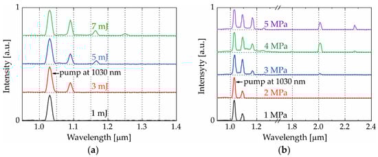 Since the Raman gain is proportional to the density of the medium [23], the conversion efficiency of transient SRS strongly depends on the hydrogen pressure. Thus, the hydrogen pressure has also been optimized to ensure the most efficient generation of higher-order rotational Stokes components. Although the SRS linewidth broadens with increasing gas pressure [29], in our experiments, this effect was negligible since the pump laser linewidth exceeded the SRS linewidth [31]. The dependence of the SRS spectra on the hydrogen pressure at a pump pulse energy of 7 mJ is shown in Figure 3b. Here, as before, the first peak corresponded to the Yb:YAG laser pump wavelength at 1030 nm. Due to the low Raman gain, at a hydrogen pressure of 1 MPa, only the first rotational Stokes line was observed, while the number and intensity of higher-order Stokes components increased at higher pressures. It is noteworthy that even when the circular polarization of the pump beam made it possible to completely suppress the direct generation of vibrational SRS (Figure 2b, red solid line), at pressures above 3 MPa, the first rotational Stokes pulse in turn became a pump source for SVRS at ~2012 nm (Figure 3b, blue line). When the hydrogen pressure reached 4 MPa, the cascade generation of SVRS from second-order rotational Stokes was also observed at ~2074 nm (Figure 3b, green line). Thus, at increased hydrogen pressure, two vibrational Stokes components were generated at once (Figure 3b, green and violet line), corresponding to a Raman shift of 4155 cm−1 from the first- and second-order rotational Stokes. It is also important to note that the nonlinear refractive index n2 of the medium increases with increasing hydrogen pressure [32]. As a result, a spectral pedestal (background) was formed between the rotational Stokes lines in the ~1–1.4 μm wavelength range, where additional spectral components appeared due to the self-phase modulation.