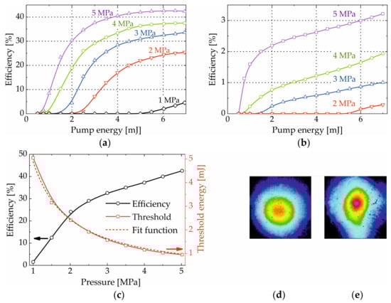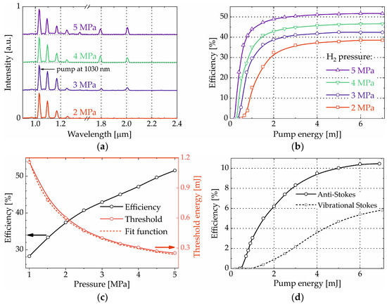 The high pump pulse energy and hydrogen pressure not only contributed to the cascade generation of higher-order rotational Stokes comb but also significantly improved the overall SRRS conversion efficiency and lowered its threshold (Figure 4). The SRRS threshold decreased from 5 mJ to 0.95 mJ as the hydrogen pressure increased from 1 MPa to 5 MPa (Figure 4a,c). This dependence corresponded to the reciprocal function 4.9/p, where p is the H2 pressure (Figure 4c, red dashed line).