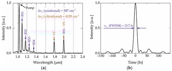 The widest spectrum of the SRRA comb was obtained at a hydrogen pressure of 5 MPa and a pump energy of 7 mJ (Figure 6a), and the positions of the observed peaks are given in Table 1. Accordingly, the spectral peaks detected at wavelengths of 1096 nm, 1164 nm, 1252 nm, and 1351 nm (designated as “RS1–4”) were assigned, respectively, to the first, second, third, and fourth rotational Stokes modes, corresponding to a Raman shift of 587 cm−1 in hydrogen pumped at 1030 nm. The spectrum also contained two long wavelength peaks centered at 1795 nm and 1997 nm. The first was assigned to the vibrational Stokes mode excited from the pump radiation and designated as “VS”, and the second was assigned to the vibrational Stokes mode excited from the first rotational Stokes component (“RS1”) and designated as “RS1-VS”.