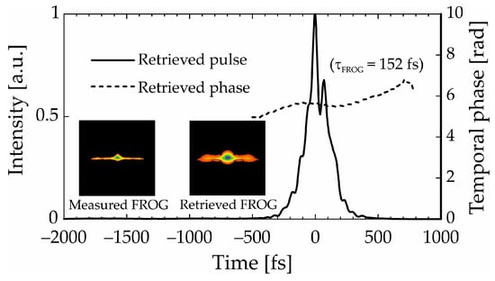 Temporal profile (solid line) of first-order rotational Stokes pulses after compression, retrieved from the SHG-FROG measurement, and the retrieved temporal phase (dashed line).