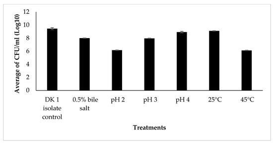 Probiotic bacteria have the capacity to produce various bioactive compounds that possess the ability to inhibit the proliferation of pathogenic bacteria. Probiotic microbes are the primary source of LAB. The probiotic candidates underwent characteristic testing in order to provide further evidence for the previously shown antibacterial activity, wherein the DK1 isolates exhibited the most prominent clear zones. In order to flourish within the gastrointestinal system, probiotic bacteria must possess antibiotic properties and exhibit resistance to low pH levels (2–3) as well as bile salts [22]. In addition, it is imperative to assess the capacity of probiotic bacteria to engage in auto-aggregation, which refers to the aggregation with similar bacteria, as well as co-aggregation, which pertains to the aggregation with dissimilar bacteria. This examination is crucial for their viability within the gastrointestinal tract and their ability to counteract harmful bacteria [23]. The bacteria DK1, referred to as the control isolates, were grown in MRSB media and incubated at 37 °C for a duration of 24 h. The results of the LAB characterization test demonstrated that the bacterial isolate DK1 exhibited the ability to thrive in an environment with a bile salt content of up to 7.99 log CFU/mL, as depicted in Figure 1.
