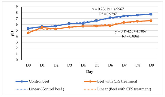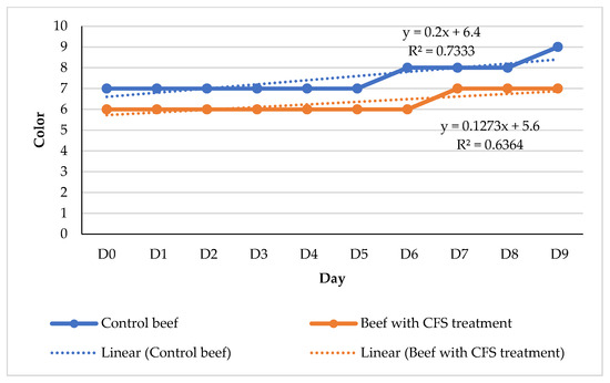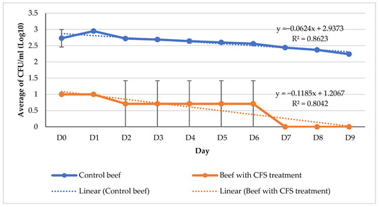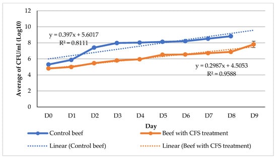 On the initial day of the experiment, the quantity of microorganisms present in the untreated beef sample was recorded as 5.30 log CFU/g. In contrast, the beef sample treated with CFS exhibited a lower microbial count of 4.81 log CFU/g, as depicted in Figure 2.