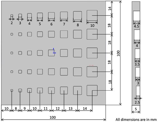 The material used for the specimens in this study was PVC. This is consistent with our previous research [18]. This set included an additional 19 specimens featuring flat rectangular indentations at the bottom. Figure 1 illustrates all potential defect locations within the dataset. The experimental setup remained identical to that described in our earlier work, with a schematic representation provided in Figure 2.