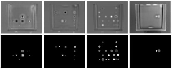 Figure 3 provides a visual comparison between an original infrared image and the result images generated by the three methods. In the original infrared frame, only four defects are discernible. However, after applying these methods, nine defects become visible, demonstrating a notable enhancement in defect contrast and detectability. Among these methods, the PCT images exhibited sufficient contrast for defects, making PCT the preferred choice for labeling tasks. Following the PCT process, one of the EOF images that contained the most-relevant information about the defects was selected for further analysis. The labeling of the defects’ position can, therefore, be facilitated by examining this selected EOF image. Once the defect locations had been identified, the subsequent step involved integrating the depth information from the defect plan, as illustrated in Figure 4.