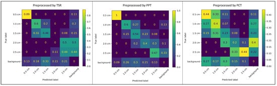 Confusion matrix of the results on the datasets preprocessed through TSR, PPT, and PCT.