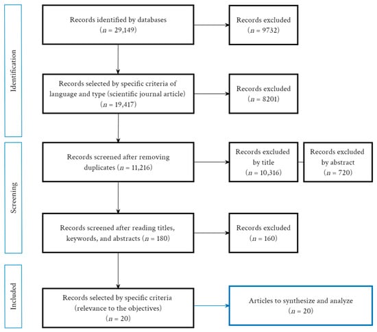 In the first stage, relevant records were identified in the databases, in this case, 29,149 records, of which 19,417 were retained for analysis (see Section 2.1). Of these, 8201 duplicate records were removed, leaving 11,216 records for review. Next, following the PRISMA 2020 workflow, an evaluation was conducted based on: (1) selection of relevant titles for final inclusion; (2) abstract screening; and (3) full-text screening (see Section 2.2). In stage 1, title screening, 10,316 records were excluded, leaving 900 records for abstract and full-text screening. During abstract screening, 720 records were excluded, leaving 180 records for full-text evaluation. Finally, after full-text screening, 160 records were excluded, resulting in 20 final studies for data extraction and analysis.