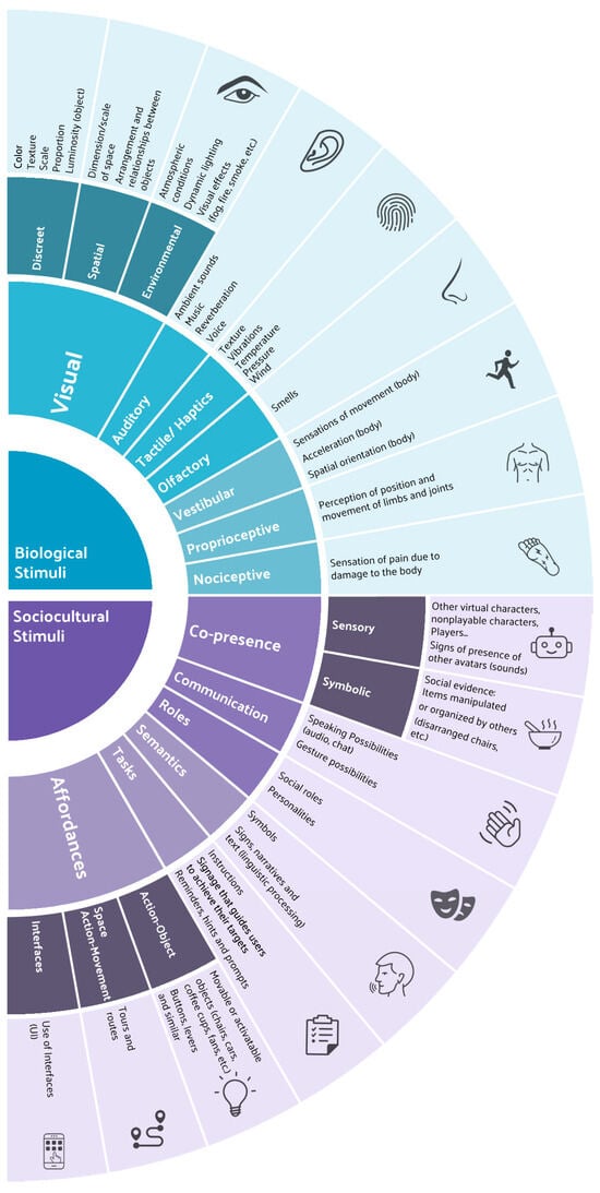 Table 3 depicts the taxonomy developed for environmental stimuli related to the built environment. Archer et al. [26] defined these stimuli as attributes of the environment (environmental and architectural characteristics) that act through psychological processes, such as the results of sensory perceptions (e.g., spatial distribution, landscape, biophilic elements, furniture, smell, sounds, lighting). Sakaki et al. [54] argued that it is possible to differentiate between biological stimuli, i.e., those important for basic survival and which automatically affect cognitive processing (e.g., attention, memory), and stimuli important in social life, which require elaborate processing, for example, memory and attention. Biological stimuli include those related to both interoceptive and exteroceptive senses. In social stimuli, a distinction is made between: (a) co-presence stimuli, understood as those involving interactions with others, (b) communication possibility stimuli (e.g., audio, chat), (c) stimuli that prompt users to identify the roles of actors in the VE and to play roles themselves, (d) semantic stimuli, understood as those that require linguistic processing and interpretation, (e) task stimuli, understood as those that guide behaviors and goals, and (f) affordance stimuli, based on Gibson’s theory [55], understood as users’ perceptions of the environment that prompt them to interact directly within that environment, that is, they invite them to undertake specific behaviors.