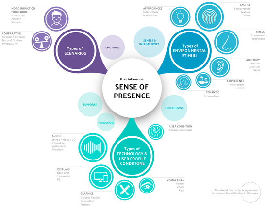 For the data-coding process, several taxonomies were established based on sub-objectives 4, 5, 6 and 7, that is, those focused on identifying the internal relationships between variables and sense of presence. To address these variables and their coding, we developed a first taxonomy based on environmental variable type, a second based on built environment type (context) and a third based on condition (technology or user profile). The taxonomies were formally established after investigating and understanding how the studies were undertaken (see Figure 2 for a graphic taxonomy of environmental stimuli).