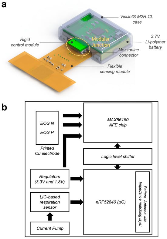 Modularized device for the simplified patient monitoring system. (a) A 3D drawing of the modularized device for the proposed patient monitoring system. (b) Configuration of the overall circuit components.
