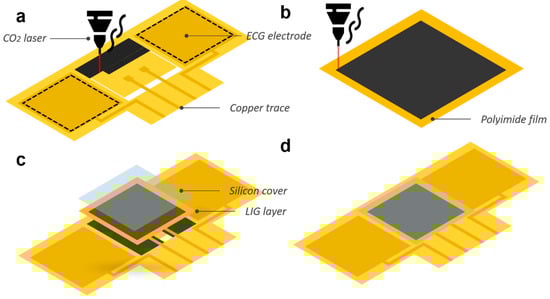 Fabrication process of the LIG-based mechano-acoustic sensor. (a) laser irradiation on the exposed PI layer of FPCB to make a stable electrical connection between copper traces and fabricated LIG sensing area; (b,c) another LIG will be formed on a single PI film stacked on the top of the LIG area on FPCB; (d) Integrated version of the proposed sensor.