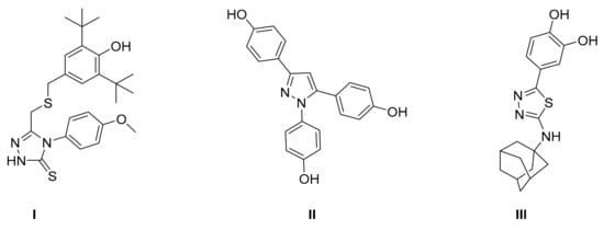 The mechanism of antioxidants’ action in different systems has been studied for several decades, but no universal approach for the development of new antioxidant molecules has been identified yet. The most up-to-date rational design approach for effective antioxidants is to combine in one molecule fragments that interfere with the action of various oxidizing agents. For example, phenols can be used for their ability to interrupt radical reactions. Likewise, S- and N-containing heterocycles can be useful to decompose hydroperoxides and chelate metals []. Thus, hydrazones [,] and thiocarbohydrazones [,] with phenol fragments exhibit strong antioxidant activity. Of note is that antioxidants containing heterocyclic fragments in their chemical structure are also of considerable interest. 1,2,4-Triazole-5-thione I (Figure 1) showed a higher inhibition effect of 2,2-diphenyl-1-picrylhydrazyl (DPPH) free radicals compared to standard antioxidant butylated hydroxytoluene (BHT), and demonstrated the in vitro inhibition of lipid peroxidation, decreasing the Fe2+ ion-induced lipid peroxidation of essential oils []. Pyrazole II showed activity in inhibiting the oxidation of DNA induced by 2,2′-azobis(2-amidinopropane) dihydrochloride (AAPH) []. Compound III was found to have high radical scavenging activity, reduced the ROS levels induced by H2O2, and was also found to exhibit strong activity against lung carcinoma and human promyelocytic leukemia [].