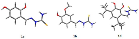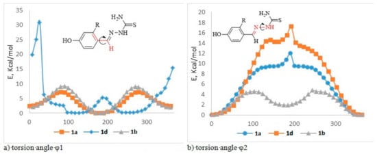 It was observed that for φ1, the E configurations reduce the stereochemical repulsions in relation to the Z, and E-isomers are more stable for 1a and 1b. For 1d, a strong spatial interaction of thiosemicarbazide fragment is observed with both OH and tert-butyl groups, forming the most stable rotamer, with a value of φ1 = 106.5. For φ2, Z-isomers were found to be more stable because of the mutual repulsion of sulfur and oxygen atoms of the phenolic group.