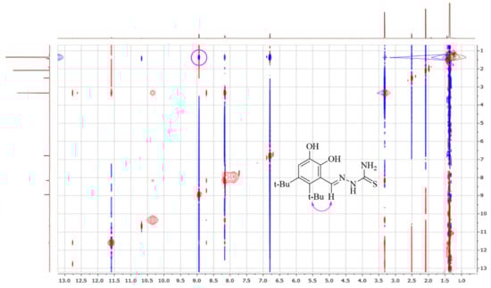 In order to consider the predicted energy values with the structure of the compound 1d, the 2D-NOESY spectrum was recorded (Figure 4). In the spectrum, a correlation between the CH proton (8.94) and the protons of the tert-butyl group (1.34) is observed, as well as the absence of correlation between CH and OH protons, which reveals the structure of 1d conformer, as shown in Figure 2.