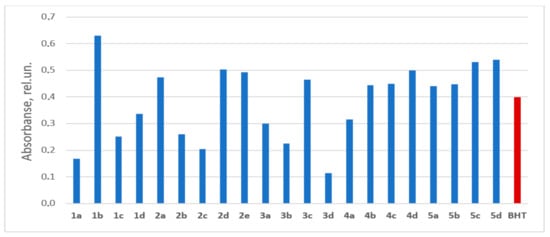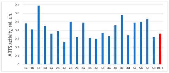 For synthesized compounds, antioxidant activity assessment was performed via the ABTS radical removal method. In the assay, ABTS radical cations are generated from the ammonium ABTS salt using a strong oxidizing agent. The radical cation has an intense absorption band at 734 nm; when an antioxidant is added, the concentration of radical cations decreases, which is determined photometrically [,,]. The results are given in Figure 5 in terms of inhibition percentages calculated against concentration using BHT as the standard. Most of the compounds showed better results compared to the standard. The exceptions were samples 2c, 3b, 3c, 4a, 4d, and 5d. Compounds 1c, 4c, and 5a–c exhibited the best results.