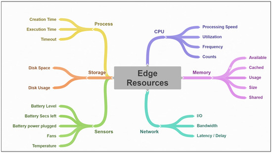 Resource profiling is the first step to determine how resources are currently being used for the best management of the hardware, and it is necessary to identify efficient methods for controlling hardware and obtaining the best performance out of it. Hence, prior to resource profiling, a selection of the edge resources and their performance characteristics are identified, as depicted in Figure 1 and Table 1, containing the respective description and metrics.The psutil (process and system utilities) Python library [36] provides access to system and process information on any supported platform such as CPU, memory, disks, network, sensors, etc. The categorization is largely based on such utility functions that can monitor edge nodes to help create the resource profile, control access to system resources, and manage processes in progress.