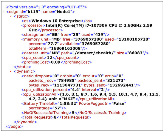 Figure 3. Edge Workload Profile.Dynamic parameters, such as CPU utilization, network statistics, and battery information are collected by the EWPM’s resource monitoring agent; static parameters are kept up to date via the nodes’ resource configuration files; and both sets of data are used to optimize the workloads. For the purpose of determining a node’s reputation, the EWP keeps track of the total number of training requests as well as the number of requests that have been successfully completed. The FWP module at the federation server further parses the EWP received from all the edges.