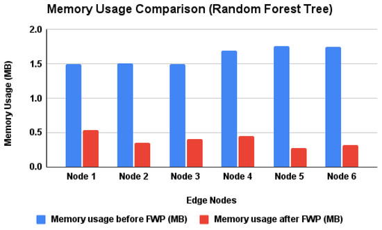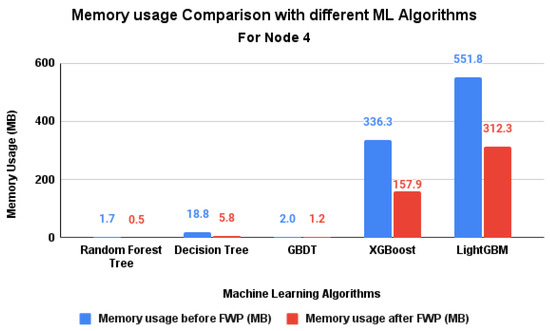Figure 4. ML algorithms memory usage comparison.After implementing the FWP resource optimization algorithms, it was found through experimentation that memory consumption dropped significantly. Additionally, it can be deduced that Random Forest Tree, followed by GBDT and Decision Tree, were the best-performing ML models. The memory usage of LightGBM was the highest of all the models evaluated. In conclusion, the experiments revealed that Random Forest Tree was the top-performing ML model in terms of memory consumption, and thus the Random Forest model was employed for the rest of the experiments. - Memory usage prior to and after FWP at different edge nodes.FWP optimization strategies were implemented across six diverse nodes as seen in Figure 5, revealing a significant drop in the memory requirements in comparison with conventional approaches. Although all the nodes benefited from FWP, Nodes 5, 6, and 2 saw the greatest reductions in the amount of memory they used, respectively.