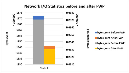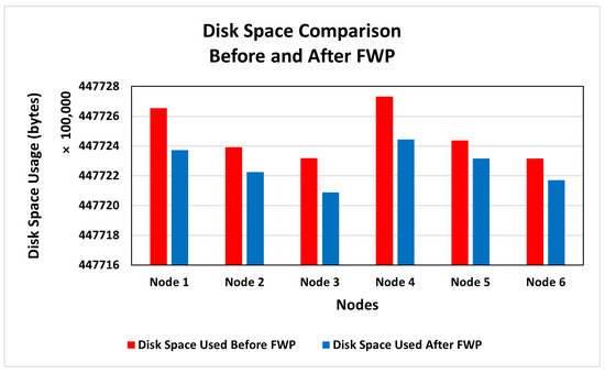 Figure 6. Impact of FWP on disk space. - Network I/O statistics prior to and after FWPEach edge node’s network I/O data were recorded, which included the characteristics bytes sent, bytes received, number of packets transmitted, number of packets received, total number of incoming dropped packets, and the total number of outbound lost packets. This I/O data analysis revealed crucial insights into the system’s overall performance and helped identify potential bottlenecks and issues. After applying our proposed optimization strategies, which included resource-aware data reduction methods such as compression, protocol optimization, and caching, we were able to visually inspect the bytes sent and received and confirmed a decrease after implementing FWP, as shown in Figure 7.